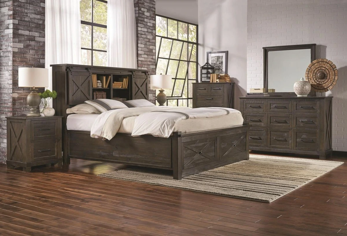 Our Sun Valley queen bedroom set evokes the rustic style of early America with a distinct charcoal finish that highlights the natural character of the solid pine. The stylish x-framed doors glide back to unveil an innovative under bed. Features an ample drawers and book storage. Read More
