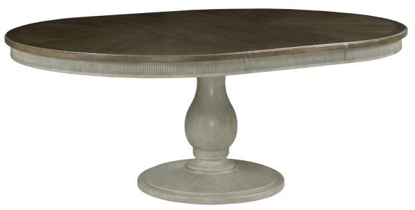 Octavia round dining table is great for smaller areas but will extend from 56" to 76" with one 20" leaf. The versaille finish base and contrasting geometric marquetry veneer pattern in the mocha elm finish top make this a perfect table for any dining room. Read More
