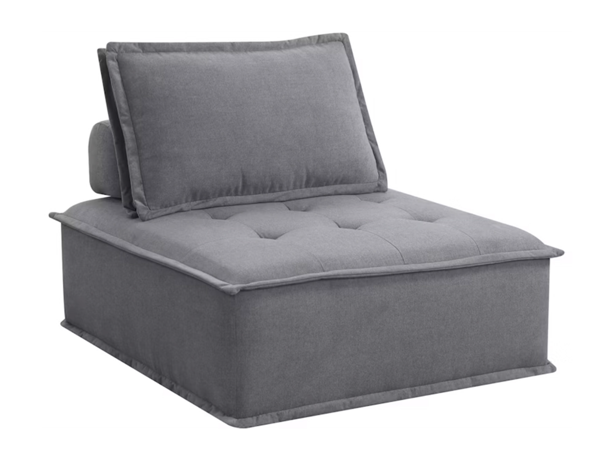 The Arcade Charcoal Armless Chair is a versatile kids' seating option, upholstered in a soft gray fabric. Featuring a tufted buttoned seat, plush pillow, and supportive backrest, this chair combines comfort and style. Its modular design gives it the appearance of a sectional piece, making it perfect for pairing with other furniture or using as a standalone chair. Ideal for playrooms, bedrooms, or lounging areas, the Arcade Charcoal Armless Chair offers cozy seating with a modern touch.