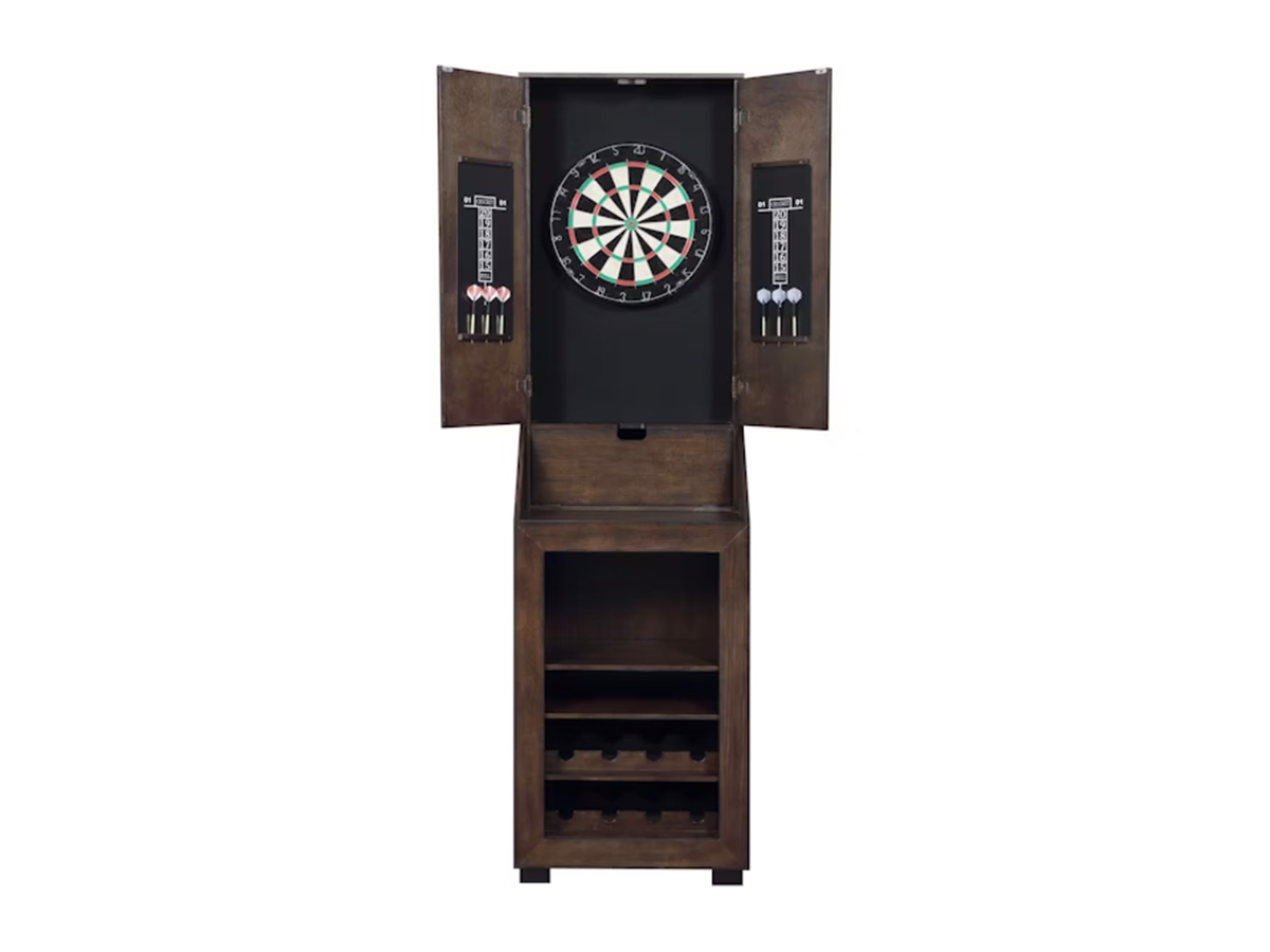 The Arcade Dart Cabinet combines classic style with functional design, making it a great addition to any game room or entertainment space. Crafted in a rich brown wood finish, the cabinet doors open to reveal a dartboard and convenient dart storage on the backs of the doors. Below the dartboard, a top shelf provides space for accessories, while additional shelving and bottle storage underneath add practical organization. Stylish and versatile, the Arcade Dart Cabinet is perfect for casual games and gatherings. Read More