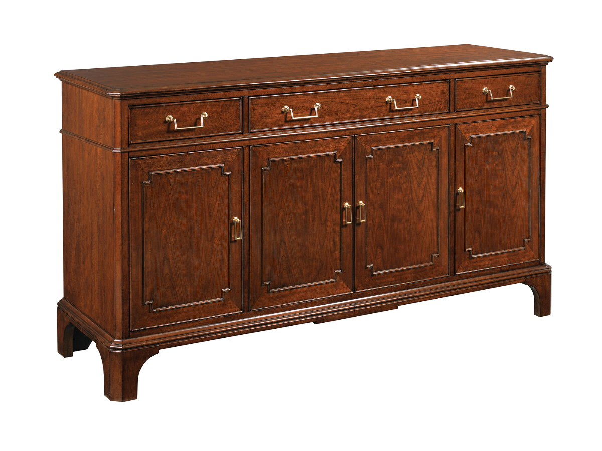 The Artesian Server combines timeless antique styling with practical storage solutions, making it a stunning addition to any dining room. Crafted from cherry and walnut veneers, this piece showcases the natural beauty of its wood grain, intricately accented and framed on the four cabinet doors below. Three top drawers provide ample space for storing utensils, linens, or other essentials, while the four doors open to reveal generous storage for your dining needs. Gold hardware adds a luxurious touch, enhancing the server's elegant and sophisticated design. The Artesian Server is both a functional and decorative centerpiece for your dining space.