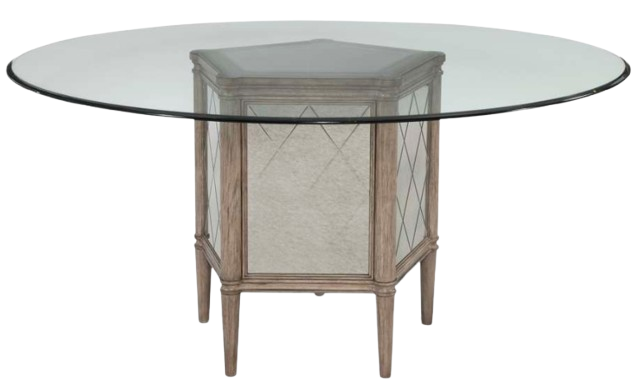 The Abrielle round dining table features antique mirror with v-groove detail and wood finished in a white peony tea finish in an octagonal finish with a 60" round clear glass top with a shaped eurogee edge. Read More