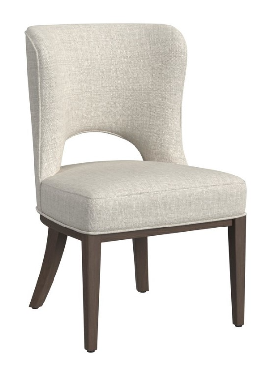 The Trevino dining chair is transitional in style with a curved seat back with arched opening and lightly wire brushed chestnut brown solid wood base. Linen-like performance fabric in neutral sand color. Read More