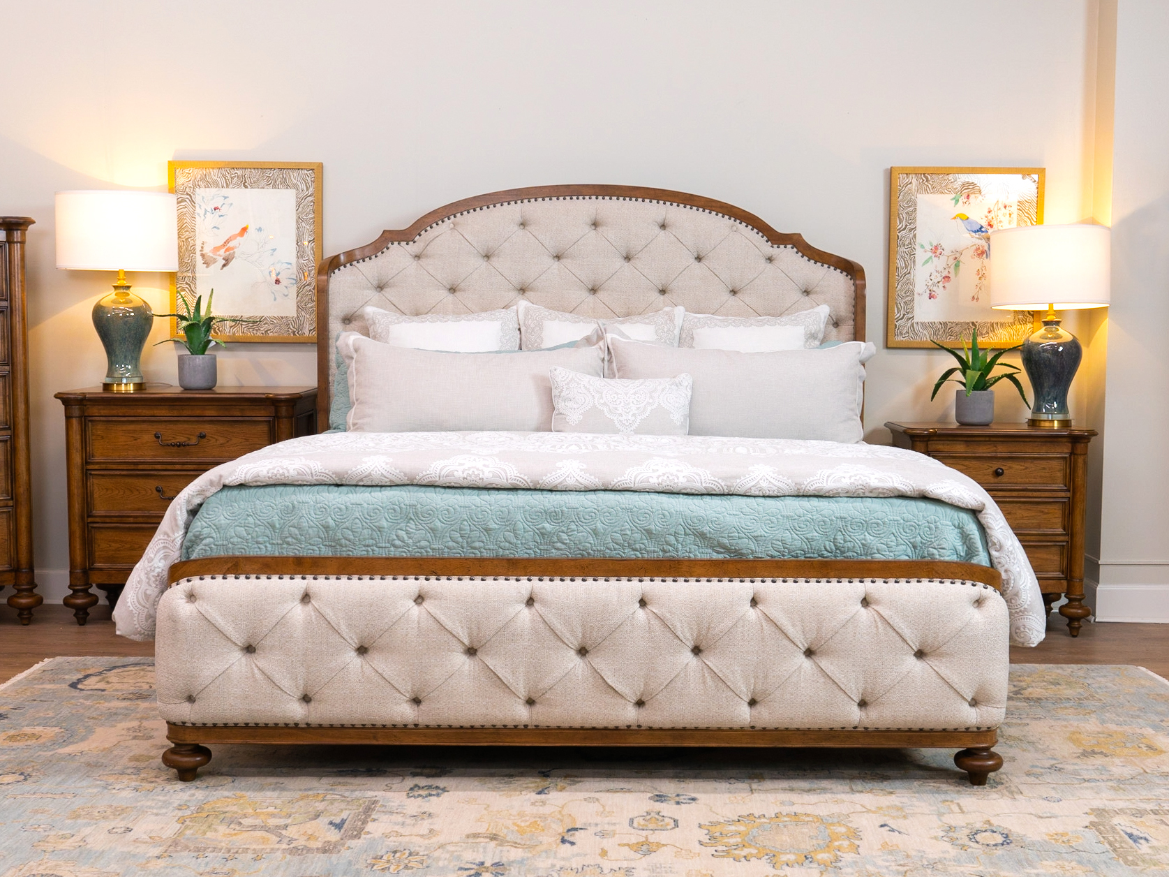 The Berkshire Upholstered Bed brings a touch of casual European traditional style to your bedroom sanctuary. Available in King or Queen size, this bed features a distinctive shelter design that frames tufted headboard and footboard elements. The upholstery is elegantly trimmed with burnished nail-head detailing, adding a refined touch to the overall aesthetic. Crafted from high-quality materials, including Hickory Veneers and Rubberwood Solids, the Berkshire Upholstered Bed boasts durability and warmth. The Warm Cognac finish enhances the richness of the wood, creating a cozy and inviting atmosphere in your bedroom. Immerse yourself in the timeless design and comfort of the Berkshire Upholstered Bed, where European tradition meets modern elegance. Elevate your bedroom with this exquisite piece, turning your space into a haven of relaxation and sophistication.