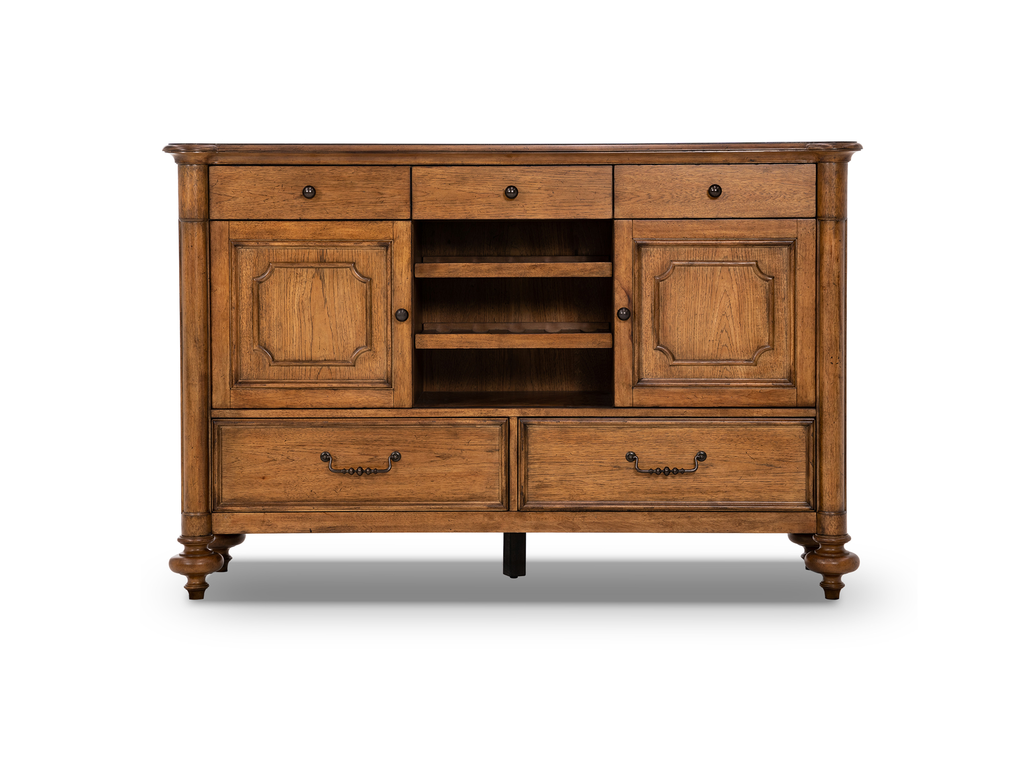 The Berkshire Buffet is a refined and functional addition to your dining space, exuding a warm Cognac-colored finish and showcasing a casual European traditional style. Crafted from hickory veneers and rubberwood solids, this buffet combines quality materials with timeless design. The buffet features five drawers for convenient storage, with three at the top and two at the bottom, providing ample space for your dining essentials. In the middle of the piece, two sliding doors reveal shelves, creating a designated area for organizing and displaying items. The inclusion of wine racks adds an extra touch of functionality, making it a perfect server for entertaining. With handholds in the back for easy movement, the Berkshire Buffet seamlessly combines practicality with classic elegance, enhancing the overall charm of your dining room.