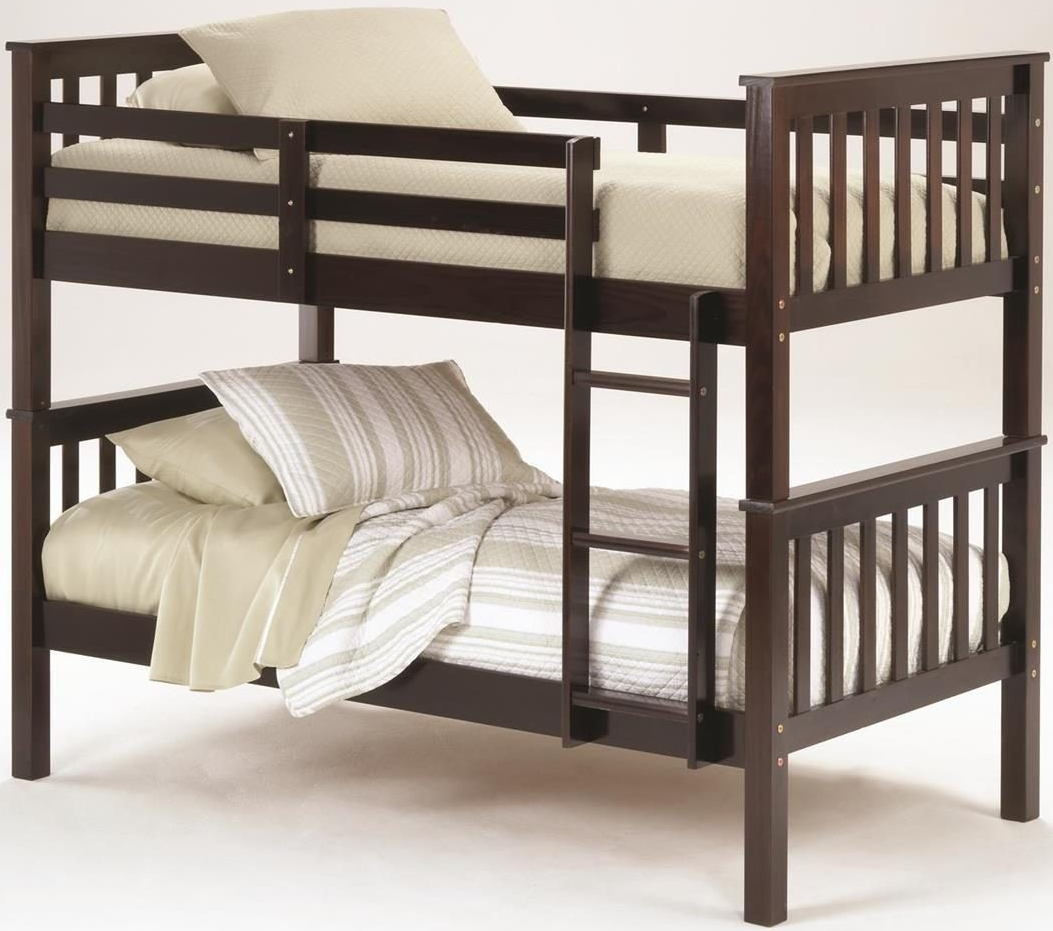 3″ post twin over twin bed in a Merlot finish. Includes ladder, safety rails for top bunk, and two sets of 4 slats for use as individual twin beds. Bunkie boards are required and sold separately. Rails are bolt through.