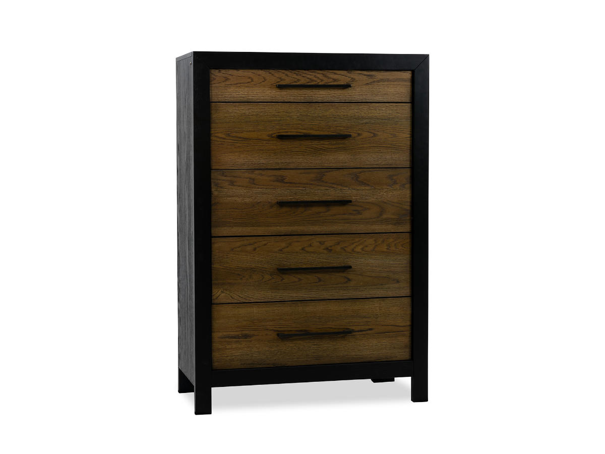 The Blair Chest offers a bold blend of modern style and everyday functionality, making it a standout storage piece for your bedroom. Designed with a charcoal-colored wood frame and five brown wood drawer fronts, it delivers striking two-tone contrast and clean, contemporary lines. Black hardware adds a sleek finishing touch, while the built-in touch light just above the top drawer, tucked beneath the black frame, provides soft illumination that's both practical and stylish. Read More