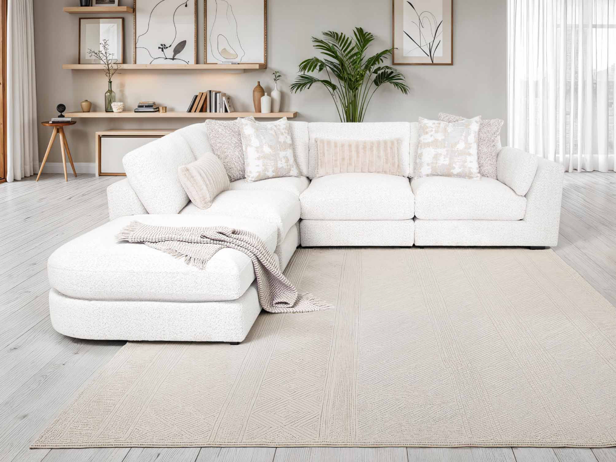 The Britney 5 Piece Sectional offers versatile design, exceptional comfort, and a bright, inviting look for your living space. Crafted in a soft light cream 100% polyester fabric, this modular sectional blends effortlessly with a variety of décor styles while providing a durable, easy‑to‑maintain surface. Its configuration flexibility allows you to arrange the pieces to fit your room, whether you prefer a classic L‑shape or a more open layout. Padded sides and backs create a plush, tailored appearance, and the reversible seat and back cushions extend the life of your sectional while keeping it looking fresh. Read More
