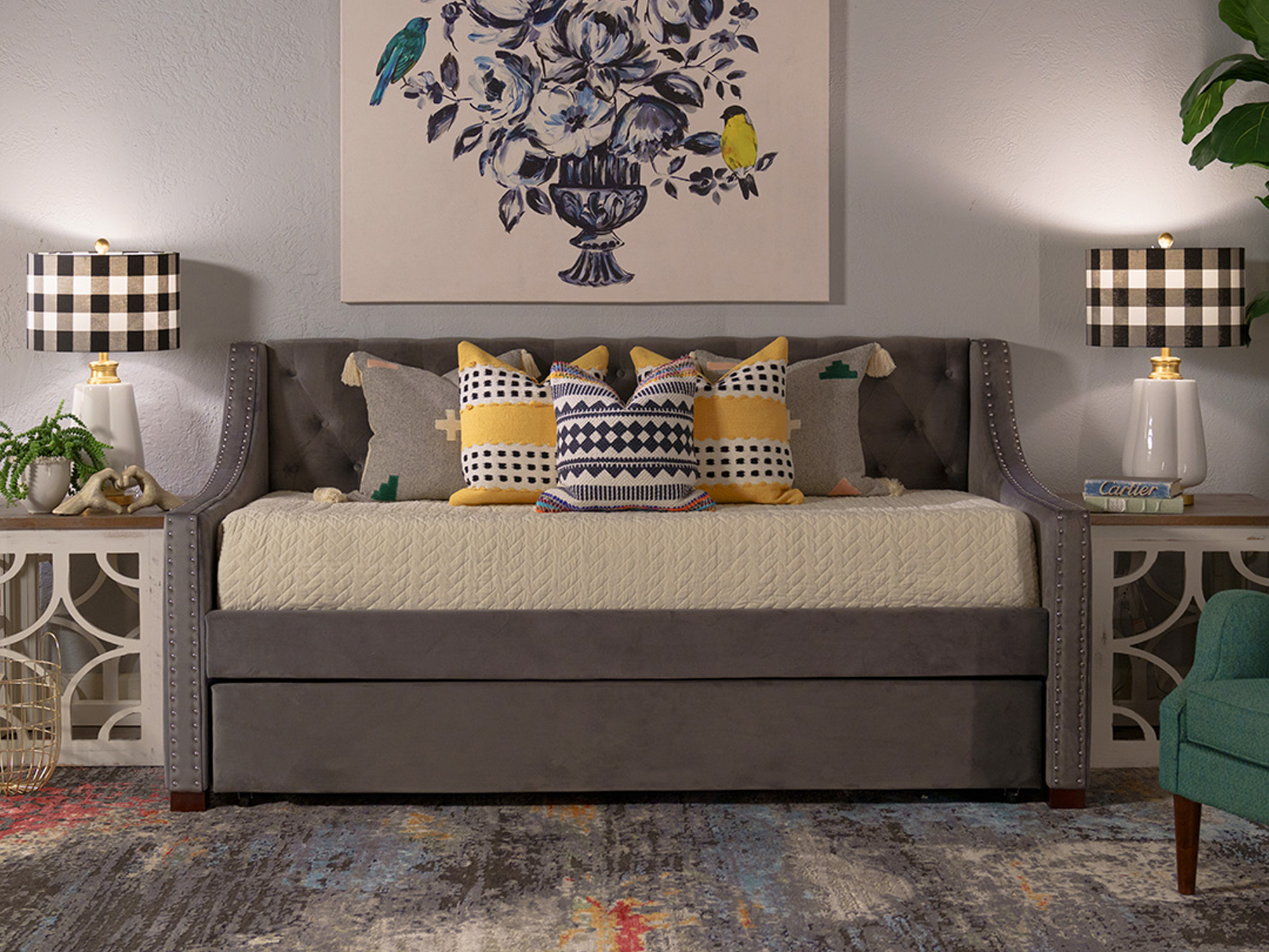 Upholstered in neutral polyester fabric, The Brooklyn daybed gives an elegant design highlighted with tufted back rest and nail head accent will give your living space the sophistication that you are looking for. There is also a twin trundle unit under the bed that easily pulls out as a guest bed. Read More