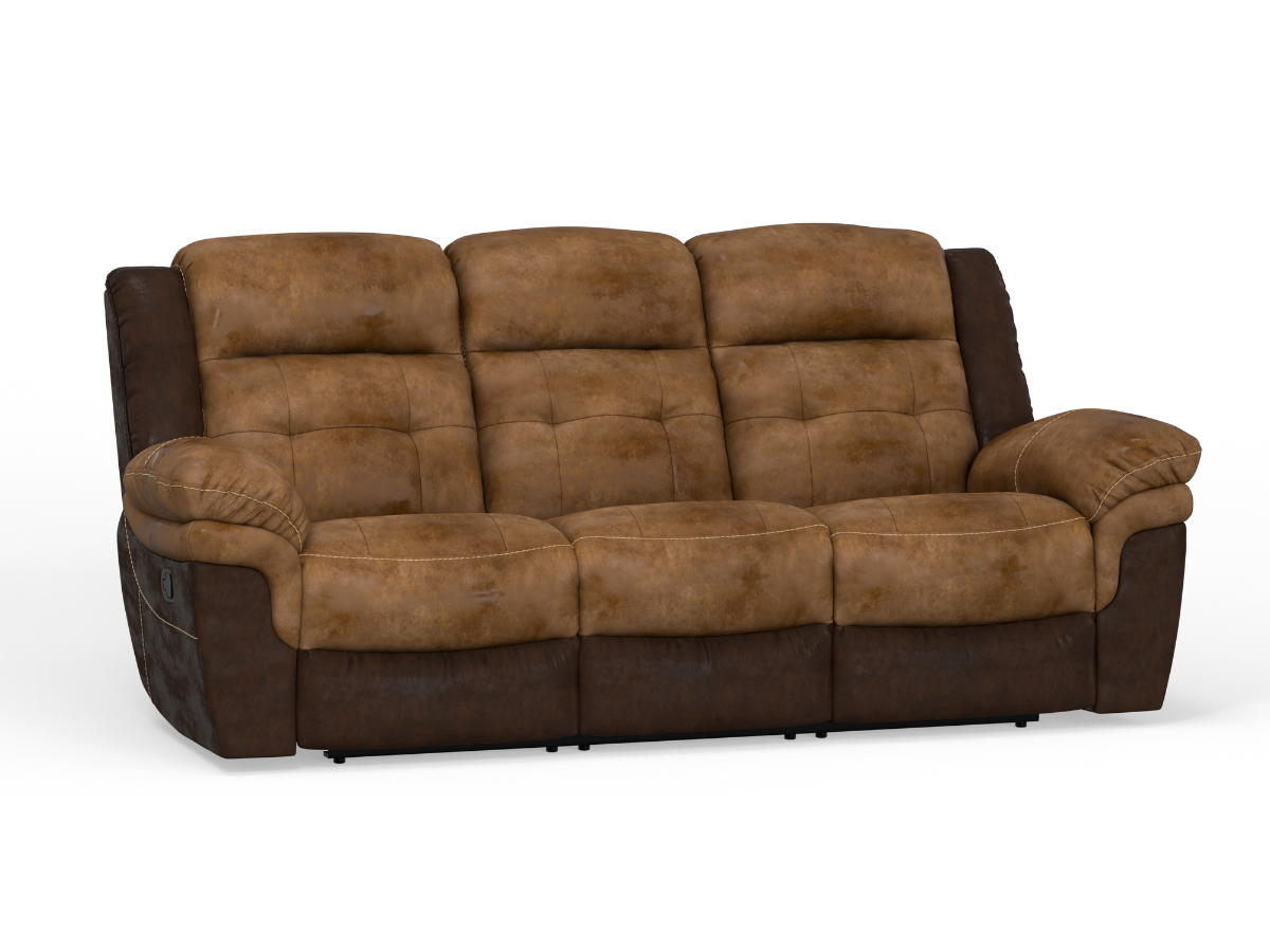 The Buckaroo Reclining Sofa brings rugged comfort and bold style to your living room with its durable construction and striking two-tone design. Upholstered in soft, high-performance polyester fabric, this reclining sofa features a deeper brown on the outside frame and a lighter contrasting tone on the seat, back, and arm cushions for added visual interest. Built on a solid hardwood frame, the Buckaroo is made to last and supports up to 350 lbs per reclining seat, making it a sturdy and reliable choice for everyday lounging. Read More