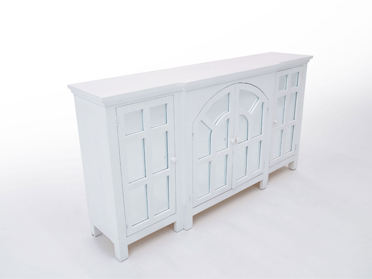 The Cathedral Console is a beautiful and elegant media console that is perfect for any home. Measuring 80 inches wide, the console features four mirror-backed doors with wooden accents and arch-inspired middle doors that add a touch of sophistication and style to your living room or entertainment space. Inside, you'll find three spacious shelves that provide ample storage space for your media devices, such as game consoles, DVD players, and cable boxes. The console is finished in an antique white color, which gives it a classic and timeless look that will complement any decor. With its beautiful design and functional storage space, the Cathedral Console is a great choice for anyone who wants to create a stylish and functional entertainment space in their home. Read More