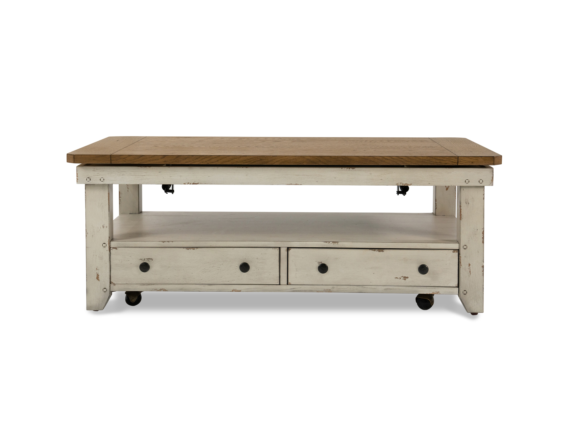 The Chambers Table collection brings a touch of rustic charm to your living space with its distressed antique white finish and light brown top. Available in both end table and cocktail table options, these pieces are designed to enhance the style and functionality of your room.The Chambers End Table features a convenient drawer at the bottom for storage, complemented by an open shelf above it. On the other hand, the Chambers Cocktail Table is equipped with a lift-top mechanism, revealing two drawers at the bottom, accompanied by an open shelf above.Elevate your living space with the Chambers Table collection, where the distressed finish and thoughtful storage solutions create a timeless and inviting ambiance. Read More
