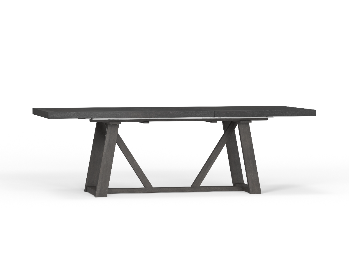 The Charcoal Dining Table combines modern sophistication with rustic charm, making it a centerpiece for any dining space. Its charcoal finish highlights the wire-brushed rustic oak veneer, meticulously arranged in an intricate diamond pattern on the tabletop. Built for both style and durability, the table features an extra-thick top and a robust, heavy-duty base. A cable-driven leaf system with a convenient self-storing leaf ensures easy expansion for larger gatherings, adding functionality to its striking design. Perfect for hosting dinners or everyday meals, this table blends elegance and practicality seamlessly.