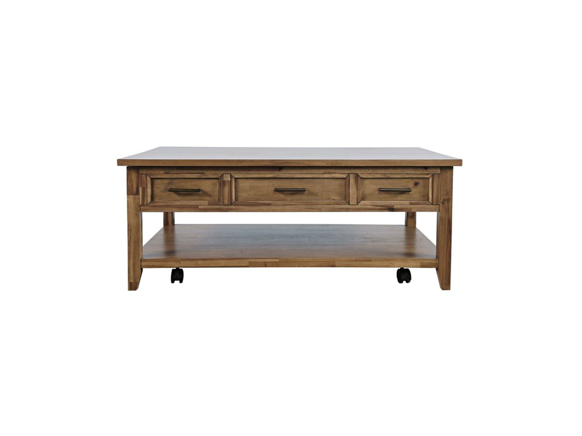 The Claire Table Collection features a versatile blend of style and functionality. The Claire Cocktail Table comes in a medium brown wood finish with a lift-top design, perfect for working or dining in the living room. It includes an open shelf at the bottom for added storage and casters for easy mobility. The Claire End Table has the same medium brown wood finish and offers a single drawer and an open shelf beneath for convenient storage. Completing the collection, the Claire Accent Table features a top drawer and a door below, providing even more storage options, all accented with beautifully simple hardware for a cohesive look.