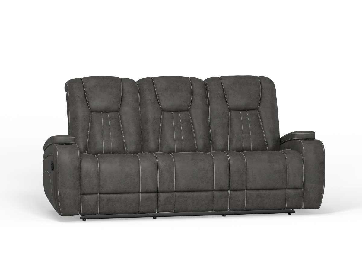The Cowboy collection features cup holders and a drop-down table. This reclining sofa is smartly designed to give you everything you need right at your fingertips. Cup holders and storage compartments in each arm are perfect for storing movie night and gameday essentials, along with the dropdown center seat table with light. Plush padding promises comfort from head to toe, enhanced by the easy-to-use manual recline function.