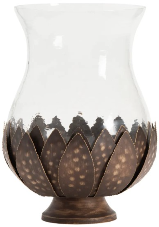 A brown finish that has been dotted with a metallic finish showing through on the underside and just the opposite on the inside of the leaves. The glass is slightly tinted and textured to give this candle holder added appeal.