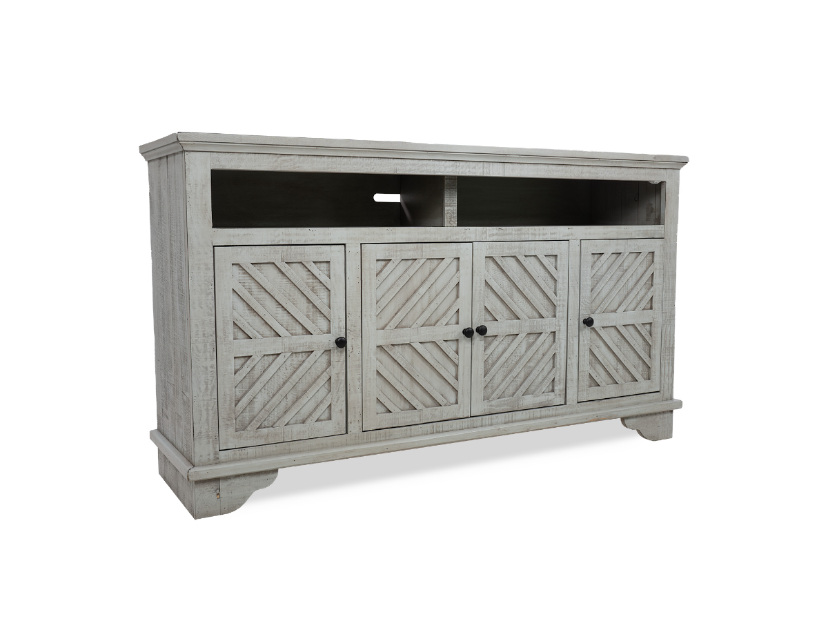The Cruz Media Console offers stylish functionality for your entertainment needs. Available in three sizes - 63, 72, and 84 inches - this console features a sleek grey finish that effortlessly blends with any decor. The four doors provide ample storage space, while the long shelf above offers a convenient spot for displaying media devices or decor items. The standout feature of the Cruz Media Console is the eye-catching chevron patterned wood detailing on the doors, adding a touch of sophistication and visual interest. Whether you're organizing your media essentials or adding a statement piece to your living room, the Cruz Media Console is a versatile and elegant choice. Read More