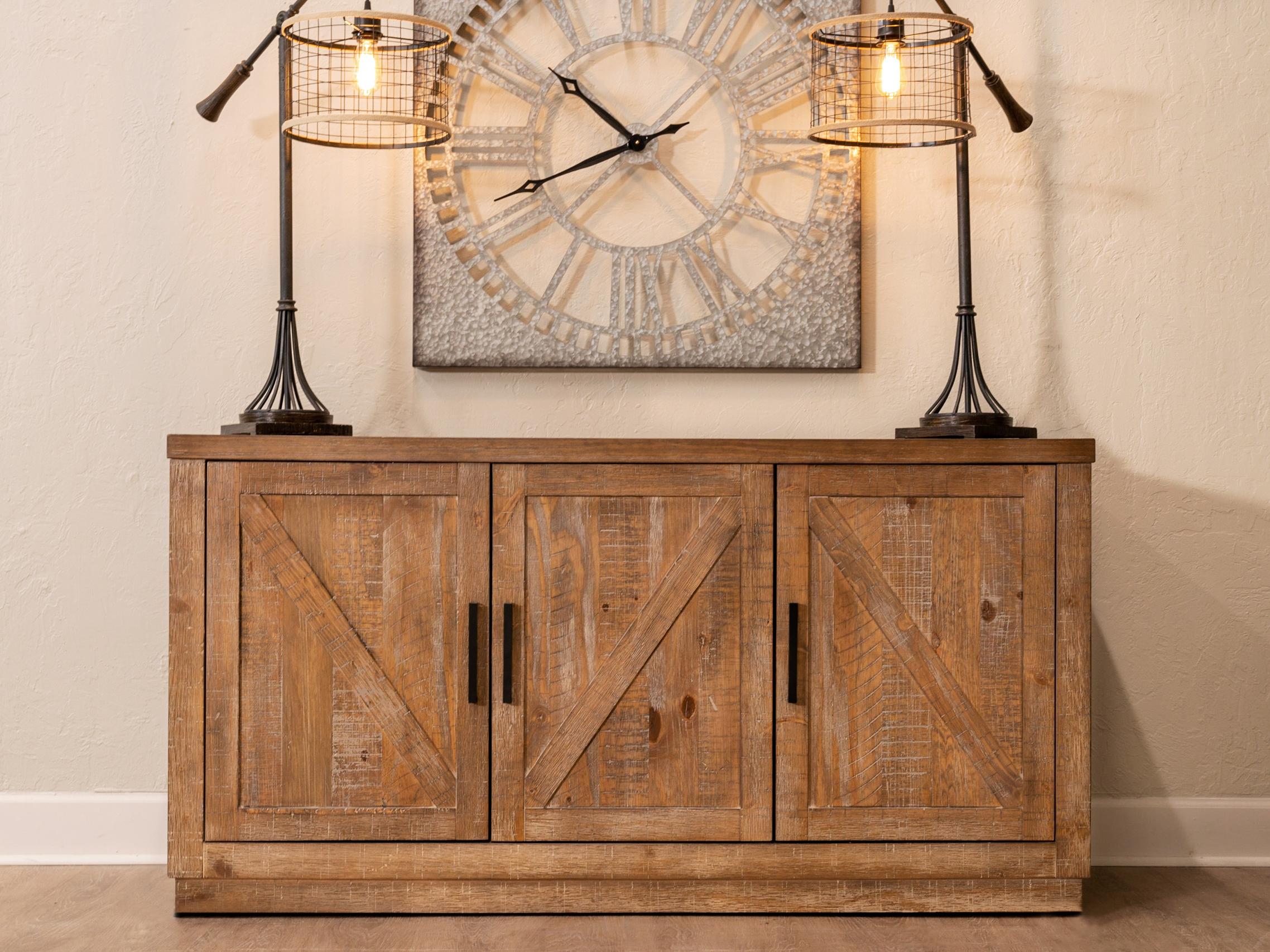 A Modern Ranch styled Server built to complement the Riverdale collection or stand alone in any rustic styled environment. This 65-inch long piece features plenty of serving area on top and sports barn-style doors that reveal two shelves for plentiful storage options. The driftwood finish and detailed distressing give the piece the feel of a time-worn antique and the look that will stand out in any casual environment. Pair with the Riverdale table or use alone as a Server or Entertainment Unit.