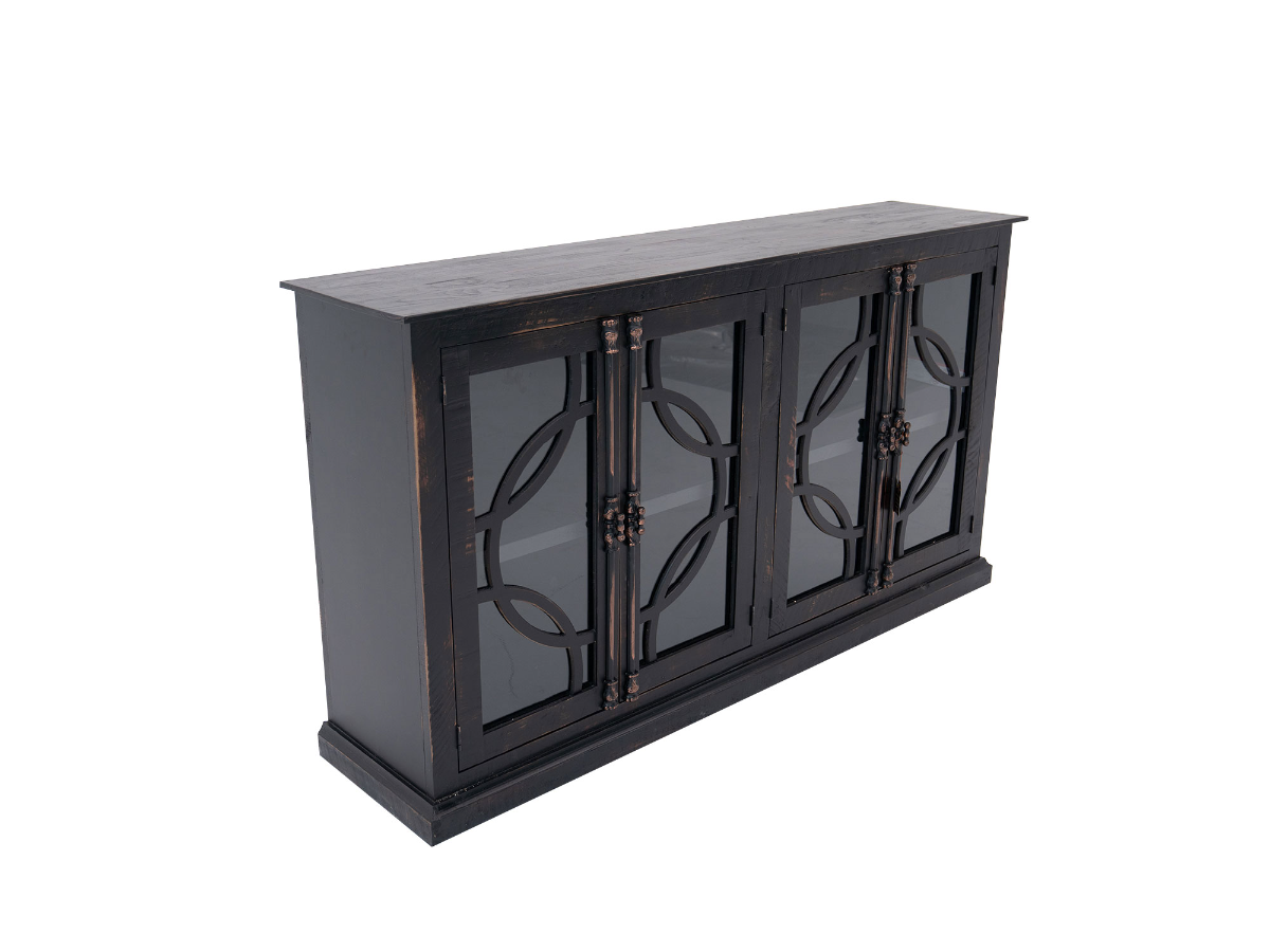 The Diamond Two Console is a stunning media console that is perfect for any entertainment space. Measuring 77 inches wide, the console features four glass doors with wooden accents that give it a unique and stylish look. The doors open up to reveal two shelves inside, providing ample storage space for your media devices and accessories. The console also features interesting detail work in brushed metal, which adds a touch of sophistication and elegance to the design. The console is made of high-quality wood in a black antique finish, which adds to its charm and vintage appeal. With its spacious design, stylish details, and functional features, the Diamond Two Console is a great choice for anyone who wants to create a chic and functional entertainment space. Read More
