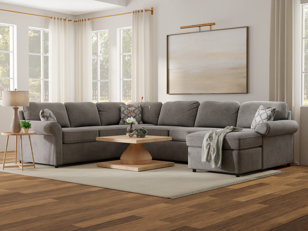 Experience unparalleled versatility and comfort with the Dominic Sectional, available in a 3- or 4-piece configuration in a sophisticated gray fabric. The 4-piece sectional features a power recline functionality on the love seat portion, enhancing your relaxation experience. The Dominic group offers endless style possibilities with its stylish rolled arm, self-welted cushions, and clean lines, making it a versatile addition to any living space. With over 400 fabric options to choose from, you can customize the Dominic Sectional to suit your unique style. Special order options include a sofa, loveseat, chair, ottoman, sleeper, storage ottoman, and sectional with and without power motion capability, allowing you to create the perfect seating arrangement for your home. Plus, the ottoman is included free with either configuration, providing added comfort and functionality. Elevate your living space with the Dominic Sectional, where style, comfort, and customization come together seamlessly. Read More