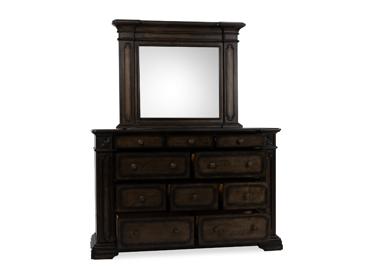 The Doral Dresser and Mirror set exemplifies timeless elegance and functionality. Crafted from acacia solids and veneers with a rich walnut finish, this dresser features ornate detailing and impeccable craftsmanship. It offers ample storage with 10 drawers: 3 felt-lined top drawers, 5 spacious felt-lined middle drawers, and 2 cedar-lined bottom drawers to protect delicate fabrics. Hidden side panels discreetly open to reveal compartments with hooks, perfect for organizing necklaces or small accessories. A large, ornately framed mirror completes the set, adding both practicality and sophistication to your bedroom.