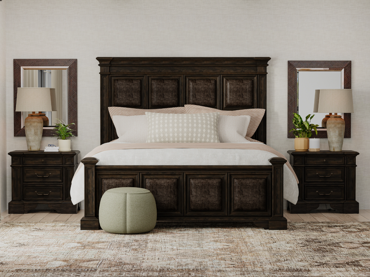The Duncan Bedroom Set delivers timeless elegance, quality craftsmanship, and smart functionality, all wrapped in a classic traditional design. Available in King or Queen sizes, this coordinated set includes the impressive Duncan Bed, a matching dresser with mirror, and a three-drawer nightstand. Each piece is crafted from durable rubberwood and finished in a rich English oak tone with oak veneers that highlight the natural grain. The bed’s oversized design is accented with faux leather upholstered squares on both the headboard and footboard, creating a striking centerpiece with warm character. Read More