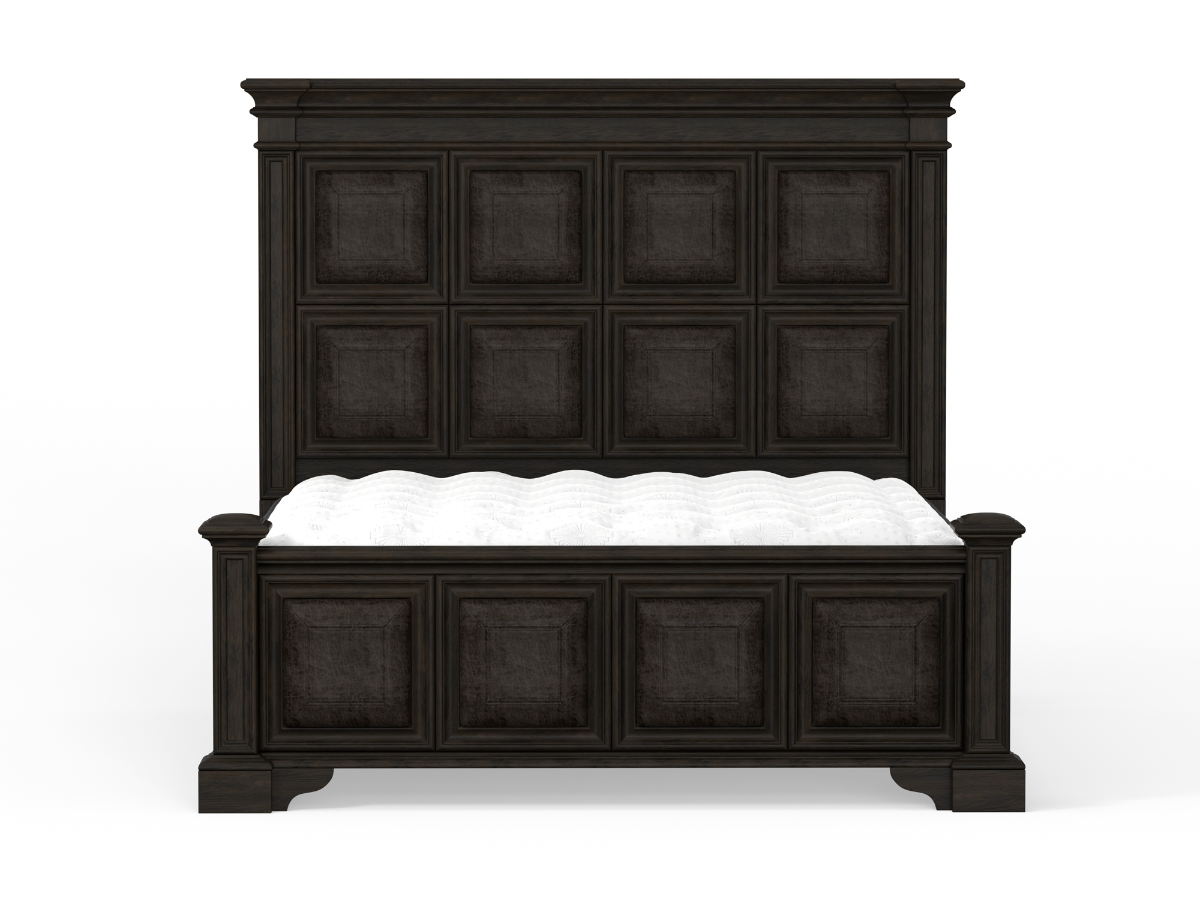 What truly sets this bed apart is the detailed headboard and footboard design, each featuring inset faux leather upholstered squares framed in wood molding. These padded panels add texture, contrast, and a touch of luxury while staying true to the bed's traditional roots. Whether you're creating a luxurious master suite or a sophisticated guest room, the Duncan Bed delivers timeless style with a strong architectural feel.