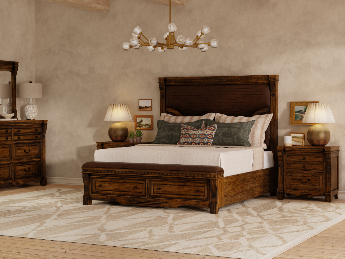 The Dutton Bedroom Set brings rustic charm, thoughtful storage, and lasting craftsmanship together in one beautifully coordinated package. Available in both queen and king sizes, this set includes the distinctive Dutton Bed, a spacious Dresser with Mirror, and the feature-rich Dutton Nightstand. Built from pecan solids and veneers in a warm pecan oak finish, each piece showcases rustic accents and detailed trim that add authentic character and timeless appeal to your bedroom. The bed features a microfiber upholstered headboard with stitching inspired by cowboy boot patterns, plus an upholstered bench on the footboard with two built-in storage drawers for added function. Read More