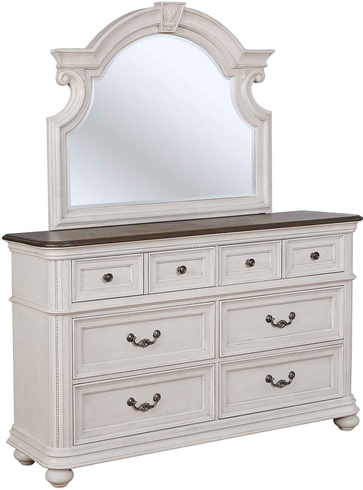 The Dynasty Dresser and Mirror set is a timeless addition to your bedroom, seamlessly blending traditional design elements with classic elegance. The dresser, finished in a weathered white color with a rich brown top, features eight drawers that offer generous storage space for your wardrobe. Crafted from pine solids and oak veneers, the dresser exudes both durability and refined craftsmanship. The beading detailing with a solid wood edge, framed drawer fronts, and detailed bracket feet contribute to the dresser's traditional charm. The English dovetail drawers showcase meticulous construction, ensuring lasting quality. The detailed white wood mirror complements the dresser, enhancing the overall aesthetic. Elevate your bedroom with the Dynasty Dresser and Mirror set, where thoughtful design and superior materials create a sophisticated and enduring ensemble. Read More
