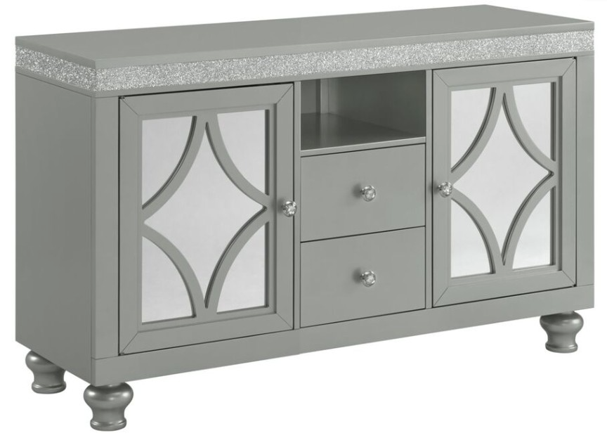 Cable holes are conveniently integrated to simplify installing electronics and reduce clutter caused by cords, while stylized bun feet offer a stable foundation. A smooth and sheeny silver finish is accentuated by an aesthetic glitter trim adorning the top perimeter. Designed for those seeking to add a touch of luxury to their entertainment area, the Avril 60” TV Stand is the clear choice.
