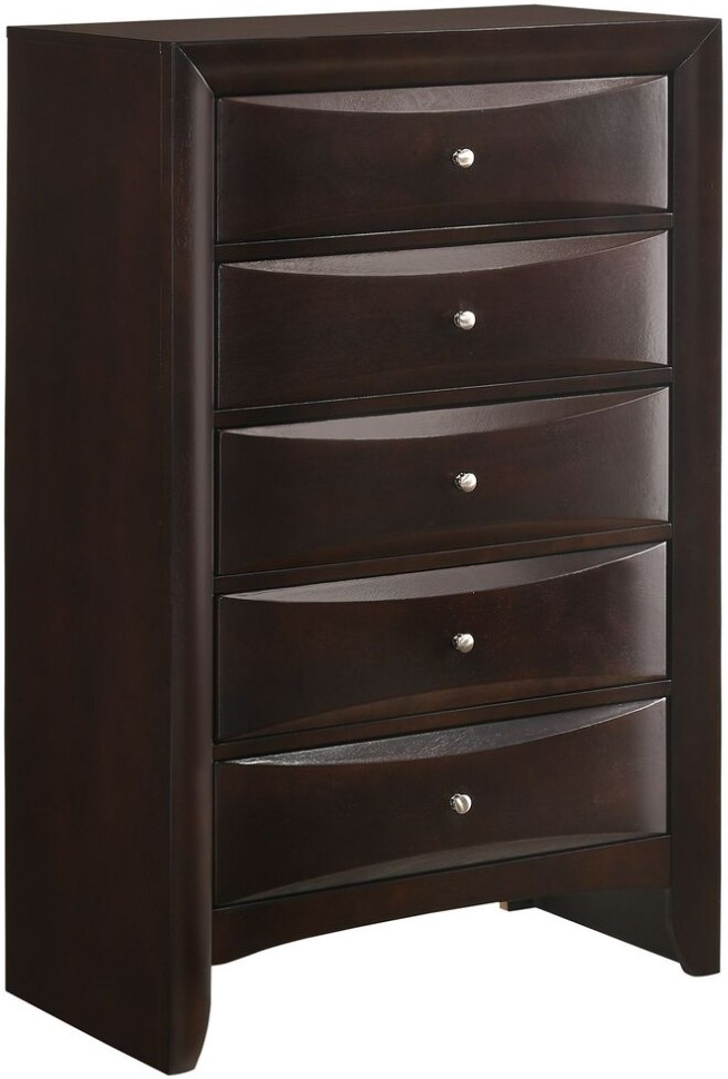 The sleek and luxurious Emily bedroom suite boasts a rich espresso lacquer finish, giving this set an air of elegance. Its contemporary, curved faux leather headboard accents the contoured drawers throughout its case pieces. The drawer construction consists of Dovetail joints, corner blocked reinforcements, and Kenlin metal glides with built in drawer stops for ease of use. Silver brushed knobs are the finishing touch to this beautiful set.