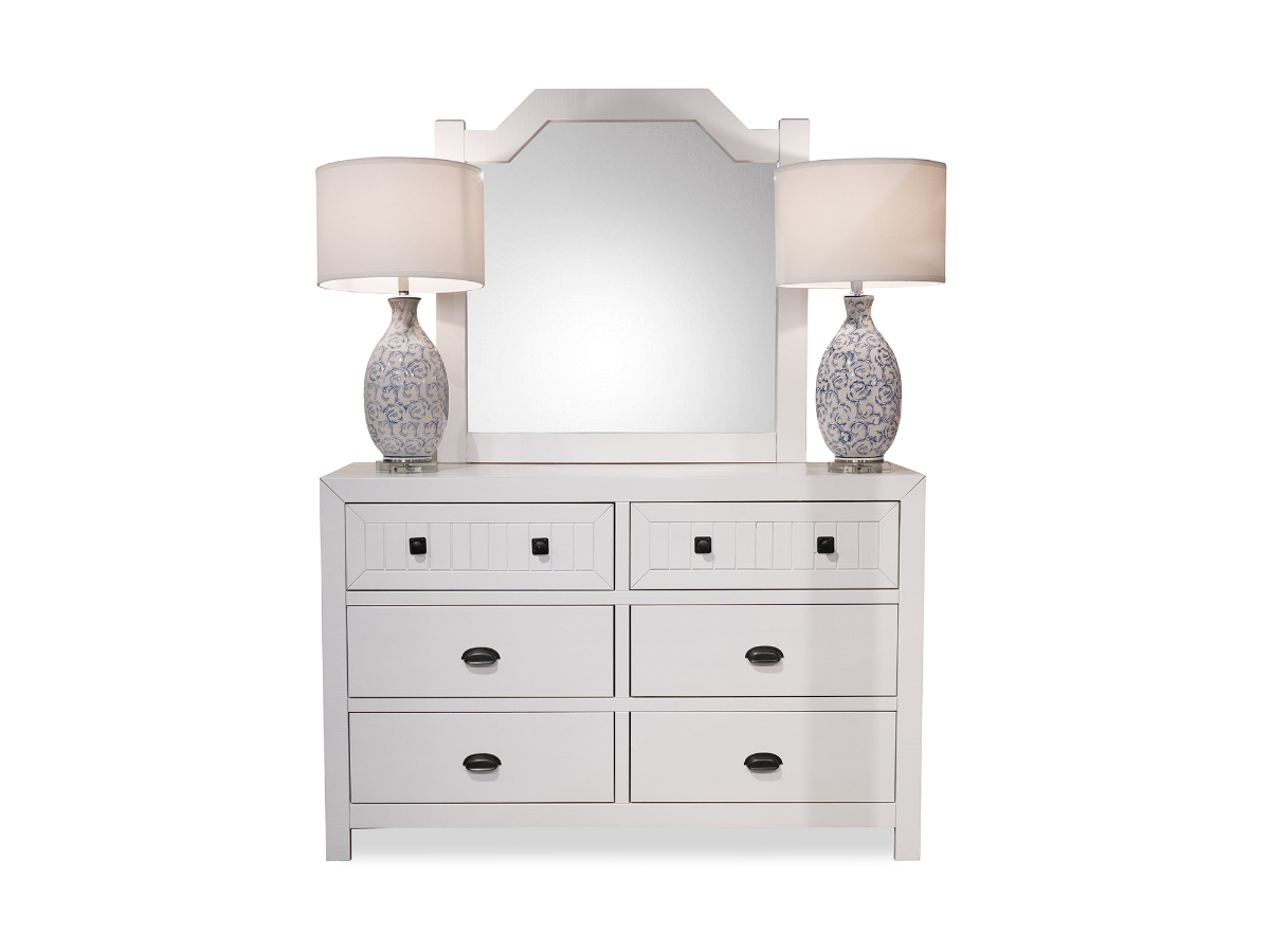 The 6-drawer dresser features a transitional design with simple lines and a casual feel. The top two drawers are accented with vertical planking detail on the fronts, adding a subtle touch of texture and charm. Spacious lower drawers provide plenty of room for clothing, accessories, and everyday essentials. Topped with a large matching mirror, this set adds both functionality and balance to the room, creating a complete and cohesive look. The Emily Dresser and Mirror set delivers durability, storage, and a classic aesthetic that works well in any growing child or teen’s space.