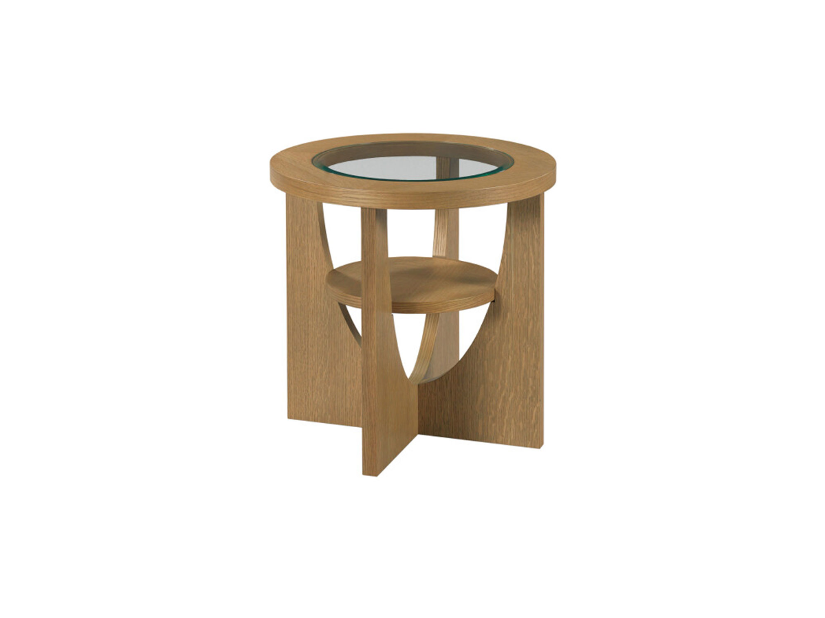 The Factor Tables are a stunning addition to your living space, combining modern design with architectural elegance. Available as a cocktail or end table, both feature a unique intersecting base for distinctive visual appeal. Each table boasts a circular glass top framed with flaky quartered white oak veneer in a warm honeysuckle finish, adding natural texture and charm. The end table includes a convenient lower shelf for additional storage or display space, making this collection both stylish and functional.