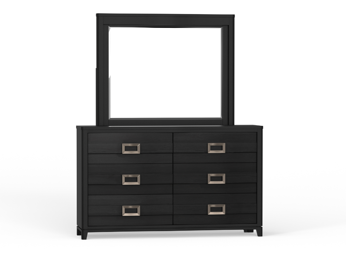 The Godfrey Dresser and Mirror set combines sleek modern design with functional elegance, making it a stylish and practical addition to your bedroom. Crafted from durable MDF and engineered wood in a bold black finish, this set features gently sloping drawer fronts that add a graceful touch to its contemporary profile. The silver square hardware provides a crisp contrast, enhancing the dresser’s clean, modern lines. With six drawers, including felt-lined top drawers for delicate items, the Godfrey Dresser offers ample storage while maintaining a streamlined look. Read More