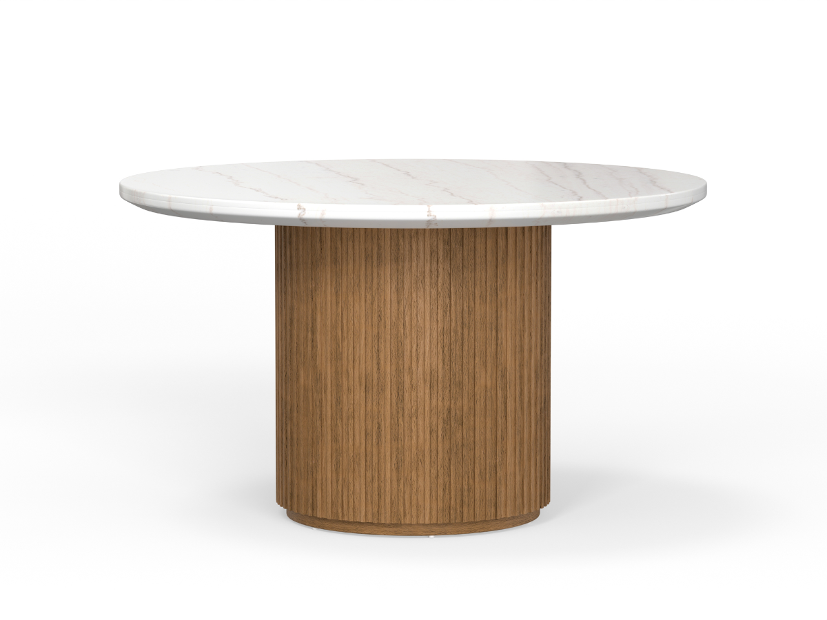 The round shape encourages conversation and creates an inviting setting for gatherings. Its distinctive reeded deco base is finished in a warm toffee tone, showcasing the natural beauty of oak and mango veneers. The base also includes adjustable levelers, ensuring stability on any flooring surface. With its blend of refined materials and thoughtful design, the Goodwin Round Dining Table is both a functional centerpiece and a stylish statement.
