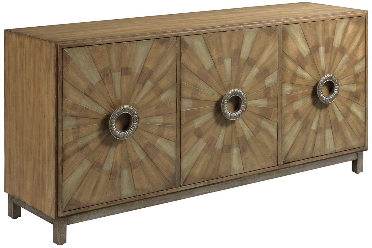 Crafted of oak, pine and walnut in a glazed, antiqued and burnished clear tone finish. Combines clean transitional design with a stunning starburst motif with a multi-step finish. The result is a sophisticated high style group that works with a variety of upholstery styles. Read More