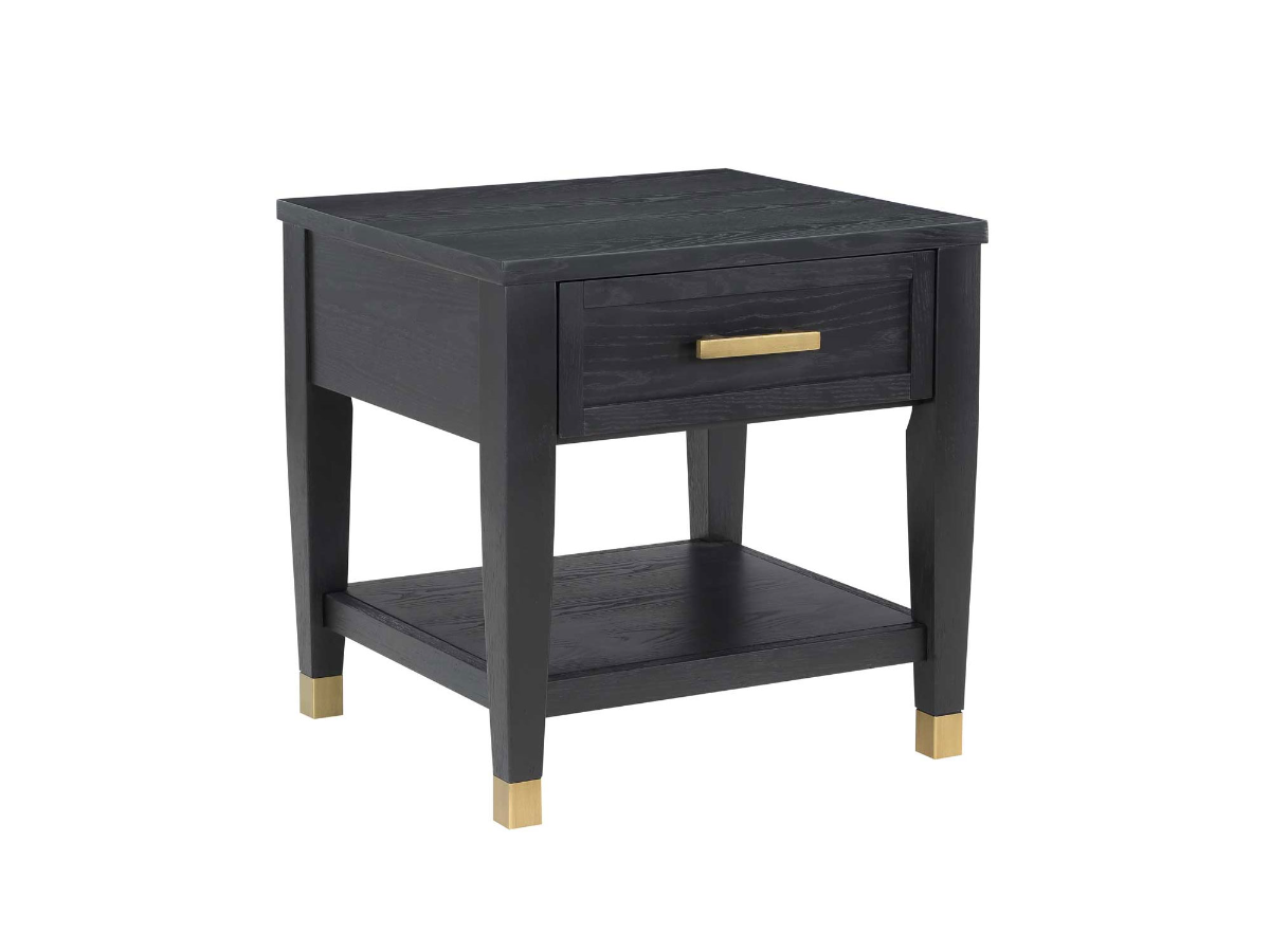 Brushed brass feet add a subtle touch of contrast and sophistication, elevating the overall look. A convenient top drawer provides hidden storage for small essentials, while the open lower shelf offers space for books, décor, or easy-to-reach items. Stylish and practical, the Inez End Table is a versatile accent for any room.
