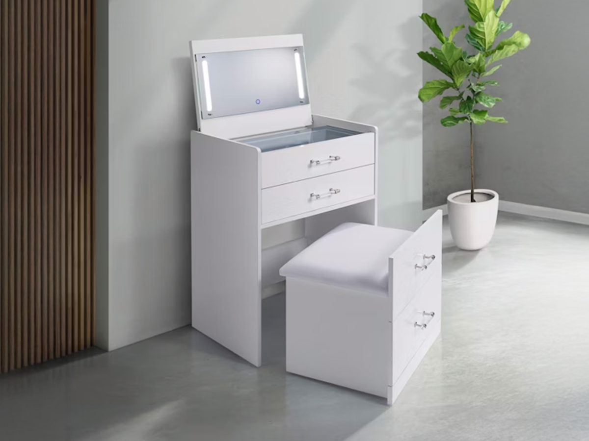 The Isla Mini Vanity is a stylish and compact solution for small spaces, available in white or black finishes. Designed to look like a sleek cabinet when closed, the top opens to reveal a mirror surrounded by soft LED lights, creating the perfect setup for getting ready. The hidden stool, tucked inside the bottom two drawers, features a padded upholstered seat for comfort and easily slides out when needed. Two top drawers provide extra storage for beauty essentials. With USB Type A and C ports included, the Isla Mini Vanity combines convenience, functionality, and elegance in a space-saving design. Read More
