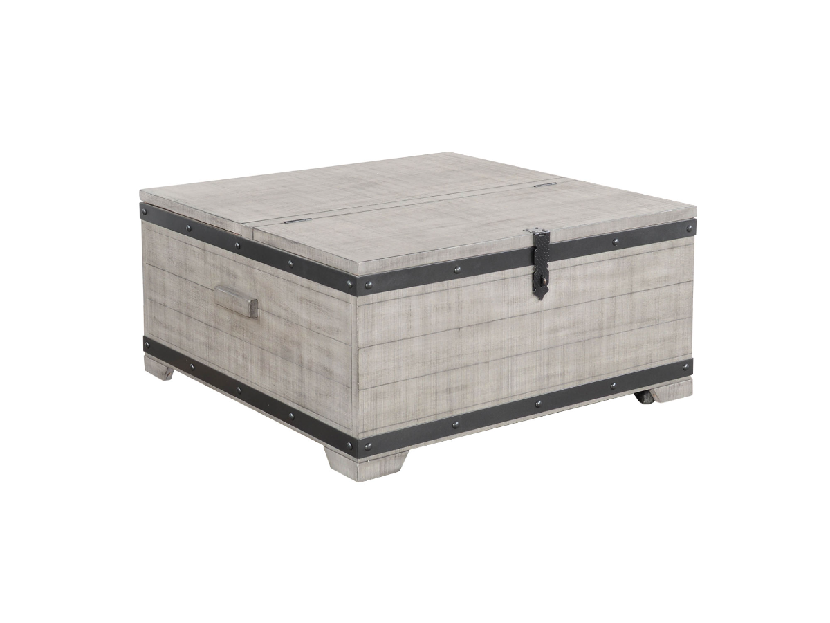 The Joshua Lift Top Cocktail Table combines rustic charm with modern functionality. Crafted from rough-sawn mahogany solids and veneers, this gray cocktail table features a lift-top design, providing a convenient workspace or dining surface. Hidden casters allow for easy mobility, while built-in storage keeps your living space organized. Metal rustic detailing bands wrap around the top and bottom, adding a rugged, industrial touch. Designed for both style and practicality, this table is a perfect centerpiece for any living room.