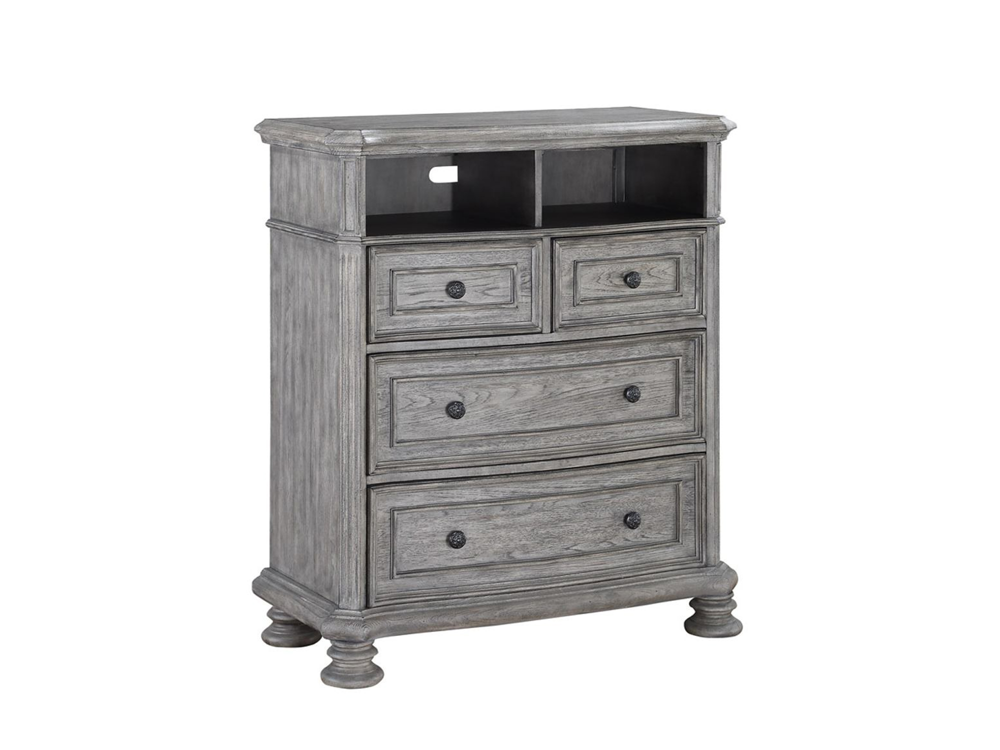 Immerse your entertainment space in the exquisite charm of the Lakeway Media Chest. Crafted from poplar solids and veneers, this media chest features a sandblasted grey pecan finish that radiates sophistication and warmth. Meticulously designed, the chest showcases the beauty of the wood grains, adding a touch of timeless elegance to your living area.Equipped with four drawers, the Lakeway Media Chest provides ample storage for your media essentials, while the cedar-lined bottom drawers ensure the protection of your belongings. The thoughtful inclusion of a split shelf below the chest top offers a stylish solution for displaying or organizing your media devices.Elevate your home entertainment experience with the Lakeway Media Chest, where quality craftsmanship meets modern functionality. Create a harmonious blend of style and practicality in your living space, making this media chest a focal point that seamlessly integrates into your sophisticated decor. Read More