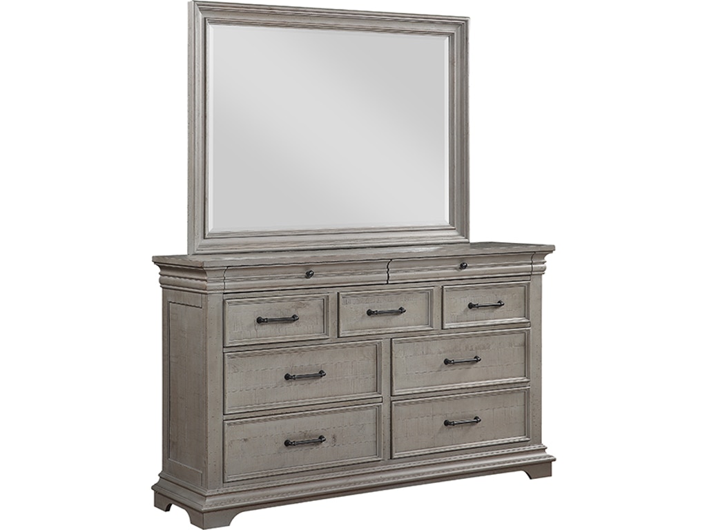 Elevate your bedroom decor with the Lansing Dresser and Mirror, a perfect blend of rustic charm and modern design. The weathered gray finish exudes character, creating a relaxed and inviting ambiance. The black hardware adds a touch of sophistication, enhancing the overall aesthetic.With nine spacious drawers, this dresser offers ample storage for your clothing and belongings. The felt-lined top drawers provide a luxurious space for more delicate items, ensuring practicality meets elegance. Complete the ensemble with the large mirror on top, reflecting light and adding depth to your space.Experience the timeless appeal and functionality of the Lansing Dresser and Mirror, a statement piece that transforms your bedroom into a haven of style and organization. Read More