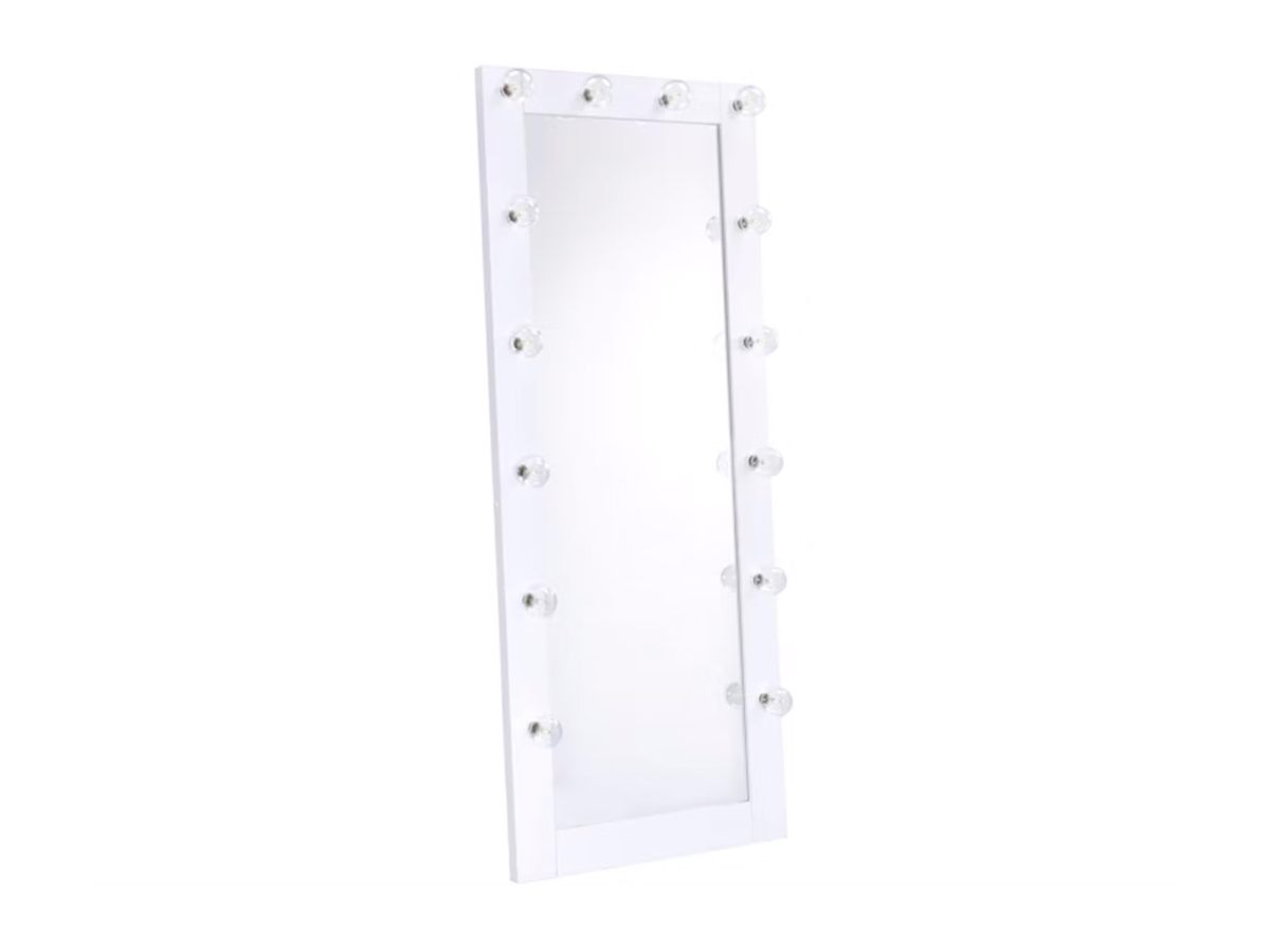 The Lexie Lighted Floor Mirror is a charming and functional addition to any kid's room. Finished in a crisp white, it features lights elegantly placed around the frame, creating a bright and cheerful glow. A convenient side switch makes it easy to turn the lights on and off, adding a touch of practicality. Perfect for helping kids get ready, the Lexie mirror combines style and function to brighten any space while making daily routines a little more fun.