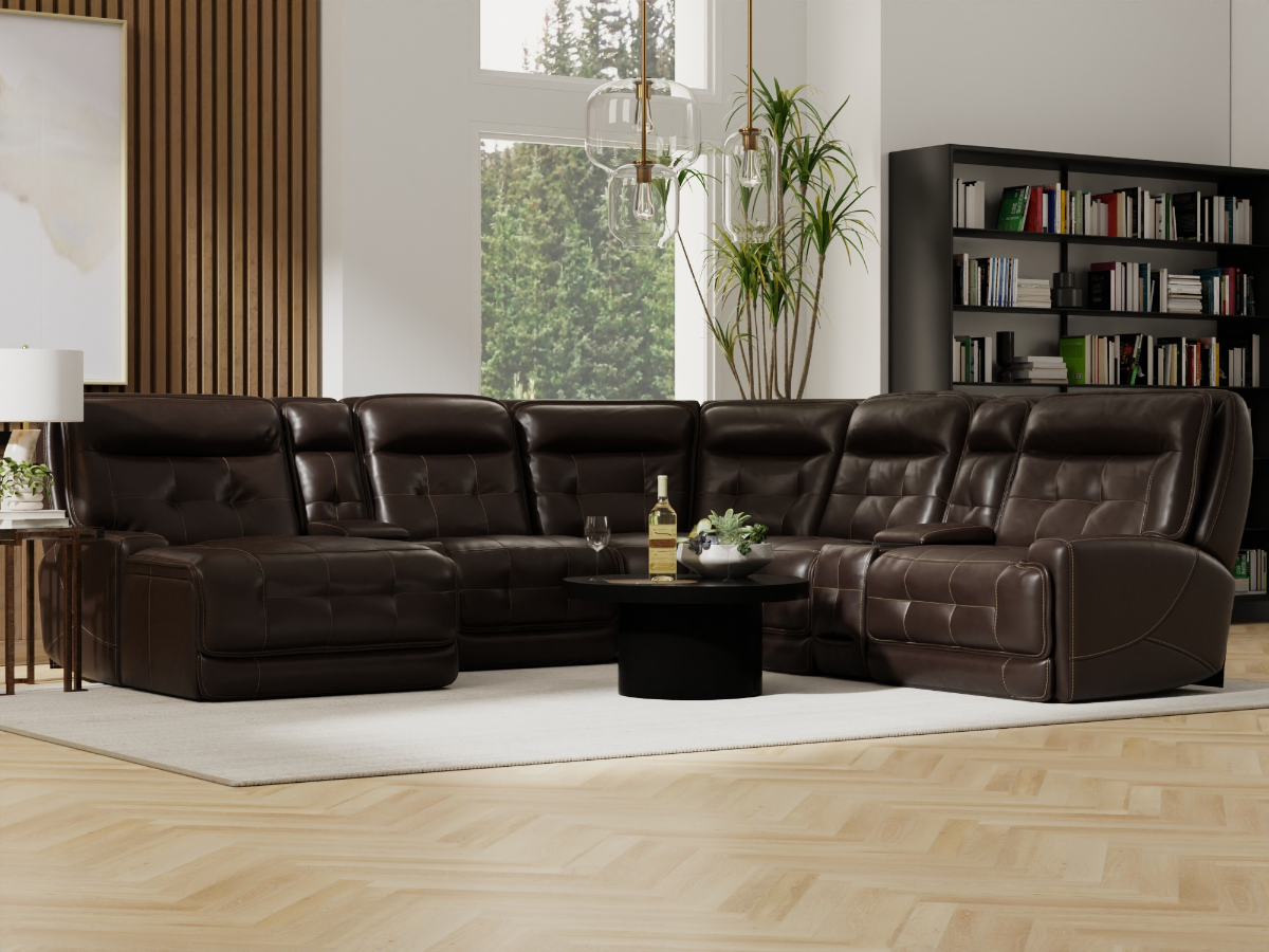 The Luxe Chaise Sectional is the epitome of luxury and comfort, designed to elevate your living space with its sophisticated style and advanced features. This 7-piece sectional is upholstered in dark brown top-grain leather, offering both durability and a touch of elegance. One of the key features of the Luxe Chaise Sectional is its versatile configuration, allowing you to choose between a left or right-side chaise to perfectly fit your room layout. The cloud seating provides exceptional comfort, while the power headrest, lumbar support, and layflat recline with an extended footrest ensure optimal relaxation. For added convenience, the sectional includes USB Type A and C ports, a storage console with cupholders, and wireless charging capabilities. These features make it easy to keep your devices powered and your living area clutter-free. The Luxe Chaise Sectional combines cutting-edge technology with timeless style, making it a perfect centerpiece for any contemporary living room. Enjoy unparalleled comfort and functionality with this luxurious sectional. Read More