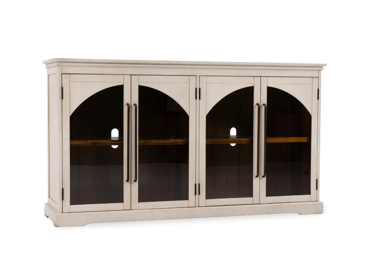The Marino White Console offers a fresh, modern look with versatile functionality, making it the perfect centerpiece for your entertainment space. Available in two sizes: 65 inches wide with four doors or 96 inches wide with six doors, this console adapts easily to different room layouts. Its crisp white finish brightens any space, while the arched glass door fronts add an elegant touch. Behind the doors, you will find shelving for organized storage of media components, décor, or everyday essentials. Read More