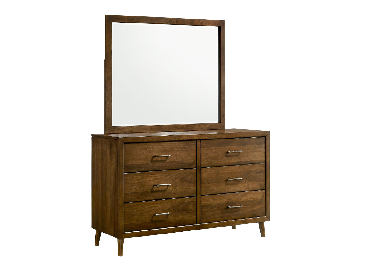 The dresser features six spacious drawers with sleek silver hardware, providing ample room for clothing and accessories while keeping the design clean and modern. The coordinating mirror adds function and balance, making it a practical and polished addition to the room. With its durable construction and stylish finish, the Maxwell Dresser and Mirror set delivers both form and function in a classic mid-century package.