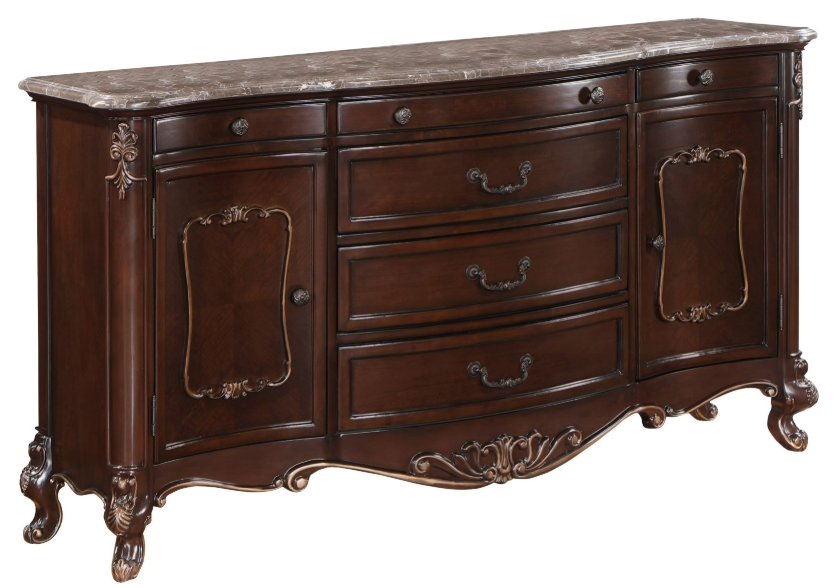 Sophisticated Touches: A Genuine Marble Top follows the curved shaping of the furniture. Bowfront drawers and cabriole legs complete the lavish look.
