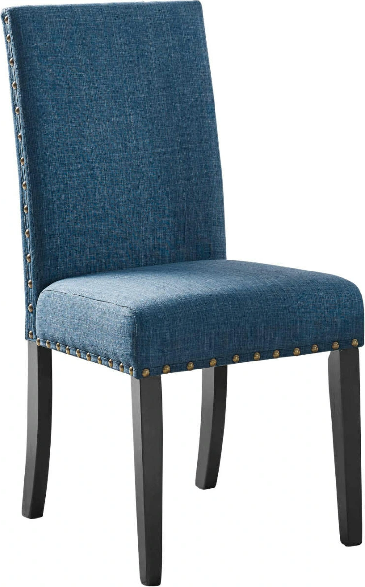 The easy care, marine blue 100% polyester fabric covers the seat and the super supportive back. Bronze nail head trim gives this chair a distinctive style. With its casual, versatile vibe and made-to-last construction, the Crispin Dining Chair is the perfect option for and accent chair or dining table seating.