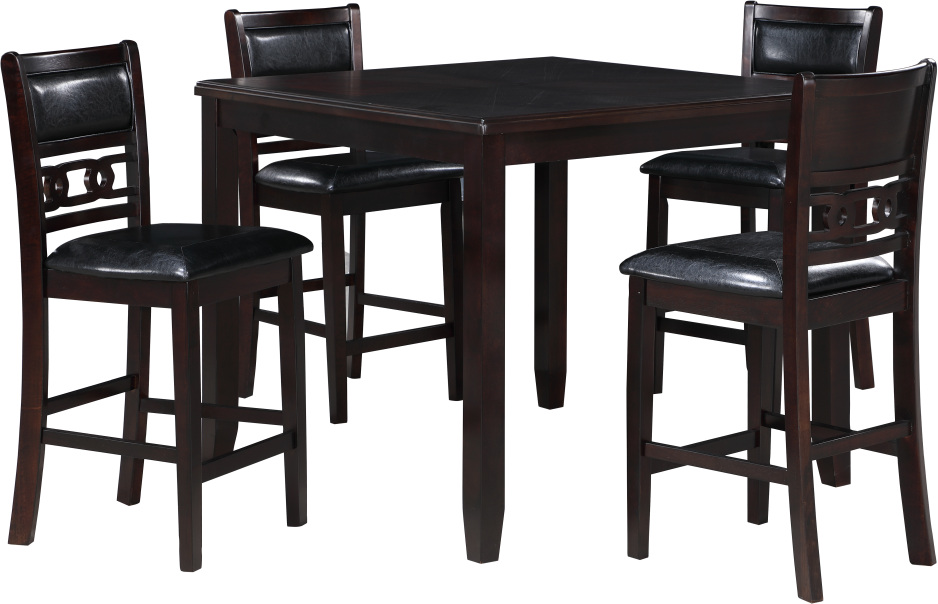 The deep ebony finish, achieved through a meticulous multistep process, enhances the natural grain of the wood. The spacious 42-inch square counter table comfortably accommodates four, making it an ideal setting for intimate gatherings. The chairs, with black PU upholstered cushions, are supported by solid wood legs reinforced with four base stretchers, doubling as footrests for added stability. The distinctive design includes a fancy face reverse diamond veneer dining tabletop, interlocking chain chair back detail, and tapered legs. Assembly is easy with all necessary hardware and clear instructions included. Backed by a one-year warranty, this Gia 5-Piece Dining Set offers both practicality and style for your dining area. Invest in quality and enjoy timeless design with this functional dining set.
