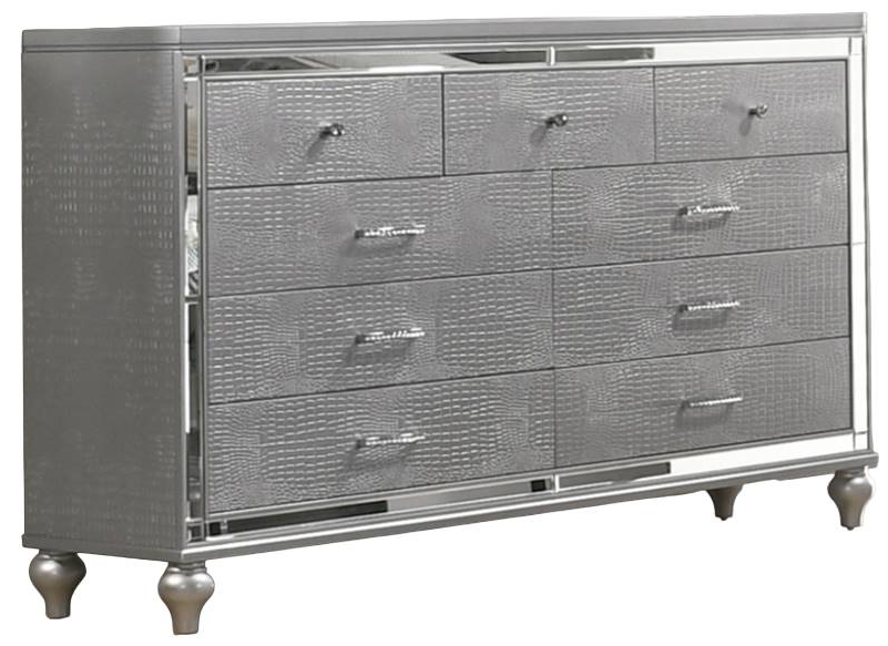 Discover the Valentino 9 Drawer Dresser in timeless Silver—a marvel of durable craftsmanship crafted from a blend of manufactured and solid woods, adorned with exquisite embossed inlays. Radiating with glitz and glam, its gleaming finish, mirrored trims, crystal-studded drawer pulls, and alligator-embossed accents capture the essence of Hollywood allure. Read More