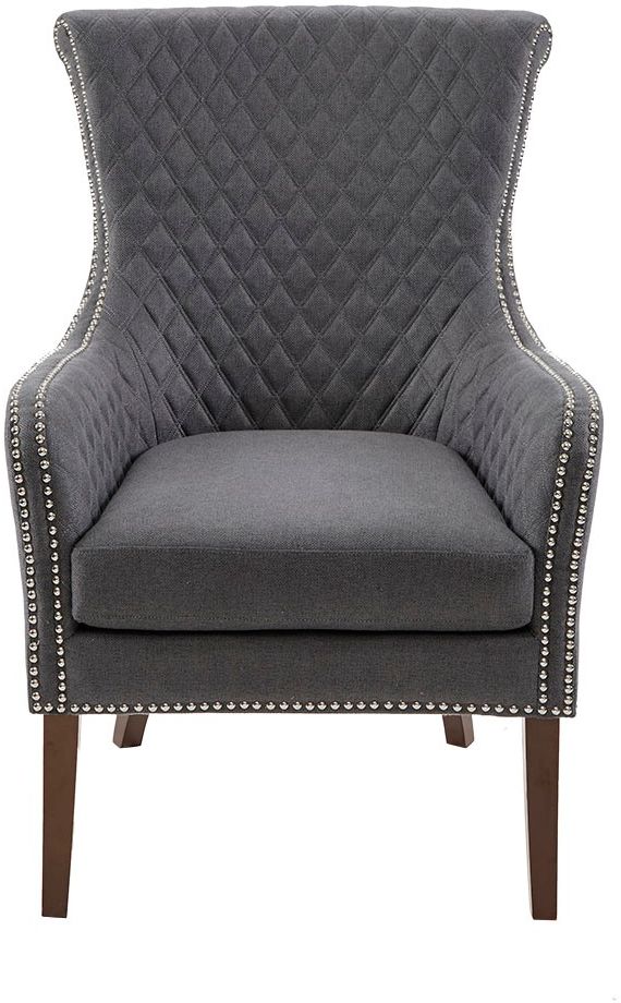 Relax in the luxurious style of the Madison Park Accent Chair. This modern accent chair takes on a classic twist with a quilted back and elegant silver studs lining the arms and seat. A high-density foam cushion fills the seat for exceptional comfort, while solid wood legs with a Morocco finish provide excellent support. Perfect in the living room or home office, this accent chair add elegance to your home décor. Leg assembly is required.